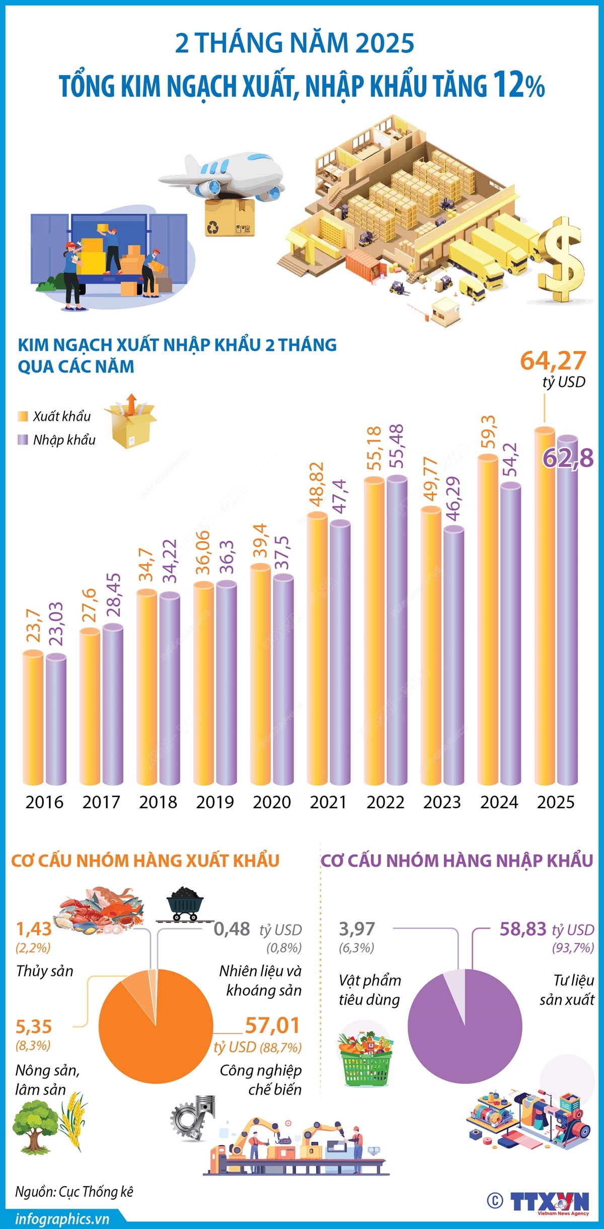 2 tháng năm 2025: Tổng kim ngạch xuất, nhập khẩu hàng hóa tăng 12%